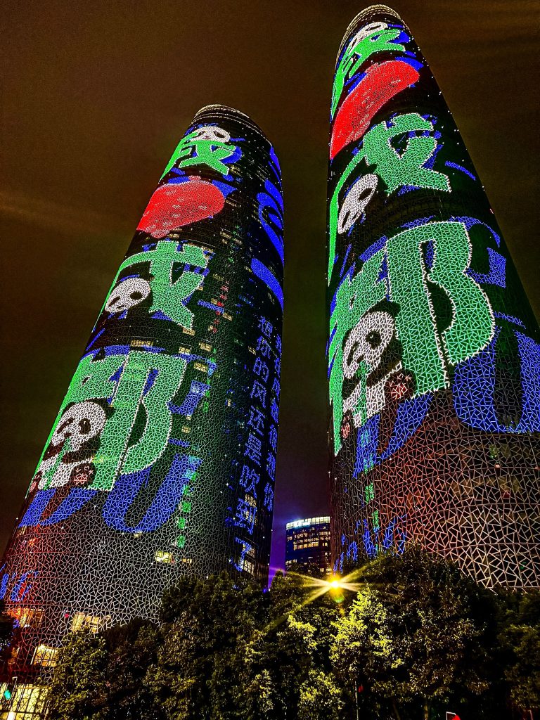 ดูโชว์แสงสีกระบอกไม้ไผ่ด้วย ของจริงสวยอยู่นะ ไฟจะเปลี่ยน ๆ ไปเรื่อย ๆ เริ่มโชว์ประมาณ 6 โมงเย็น ต่อมาไม่ไกลจาก SKP มากจะเจอตึกแฝดเฉิงตู ตอนค่ำจะเปิดไฟ LED แบบนี้เลย บอกก่อนว่าตึกจริง ๆ คือใหญ่มาก ๆ นะทุกคน