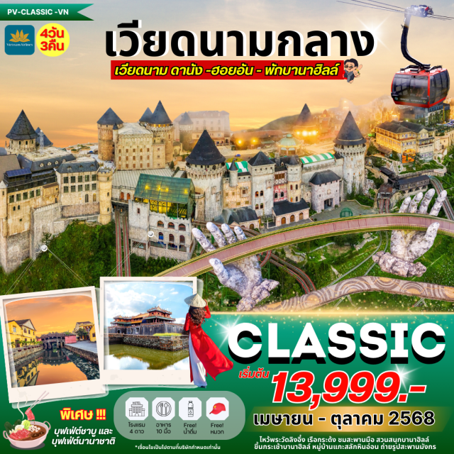 Day 1 : สนามบินสุวรรณภูมิ - ดานัง ถ่ายรูปสะพานมังกรDay 2 : สวน APEC - ช้อปปิ้งร้านผ้าไหม - เมืองโบราณ ฮอยอัน - ล่องเรือกระด้ง - หมู่บ้านแกะสลักหินอ่อนDay 3 : ไหว้พระวัดลิงอิ๋ง - ช้อปปิ้งร้านเยื้อไผ่ บานาฮิลล์ - นั่งกระเช้าไฟฟ้า - สะพานมือ -สวนสนุก FANTASY PARKDay 4 : สวนดอกไม้ LE JARDIN D'AMOUR ช้อปปิ้งตลาดฮาน - ช้อปปิ้งร้านกาแฟ - (สนามบินสวรรณภมิ)