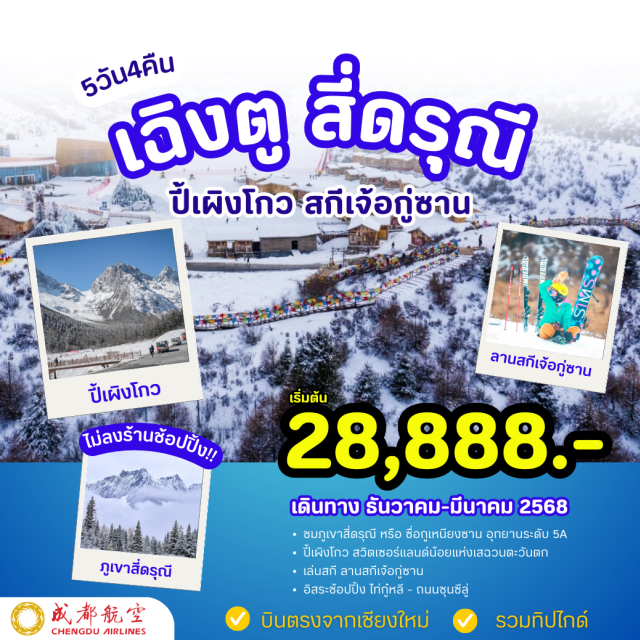 Day 1 : สนามบินเชียงใหม่ -สนามบินเฉิงตู เทียนฟูDay 2 : สามบินเฉิงตูเทียนฟู่ - เข้าที่พัก - อุทยานปี้เผิงโกว (รวมรถอุทยาน และรถแบตเตอรี่) -หลีเสี้ยนDay 3 : หลีเสี้ยว- ลานสกีเจ้อ กู่ซาน (รวมค่าเล่นสกี 2ชม.)-ตูเจียงเยี้ยน Day 4 : อุทยานสี่ดรุณี(ซื่อกู่เหนียงซาน) หุบเขาซวงเฉียวโกว (รวมรถอุทยาน) - ตูเจียงเยี้ยน Day 5 : ตูเจียงเยี้ยน เฉิงตู-ซอยแคบกว้าง- ไท่กู๋หลี ถนนซุนซีลู่ หมีแพนด้ายักษ์ปีนตึก(IFS) - สนามบินเฉิงตู(เทียนฟู่) – สนามบินเชียงใหม่