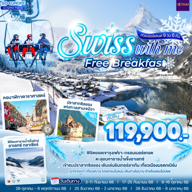 Day 1 : กรุงเทพฯ Day 2 : ซูริค-บาเซิล-ย่านเมืองเก่า-มหาวิหารบาเซิล-โลซานน์-ศาลาไทยเฉลิมพระเกียรติ Day 3 : โลซานน์-เจนีวา-น้ำพุเจทโด-นาฬิกาดอกไม้-เวเว่ย์-ส้อมยักษ์-มองเทรอซ์-เข้าชมปราสาทชิลยอง-ซิยง Day 4 : ซียง-ยอดเขาเอกกิสฮอร์น-ธารน้ำแข็งยักษ์-บริก-ปราสาทสต็อกคัลเปอร์ Day 5 : ซียง-เซอร์แมท-ยอดเขากรอนเนอร์แกรต-เบิร์น-บ่อหมี-หอนาฬิกาดาราศาสตร์ Day 6 : เบิร์น-นั่งกระเช้าและรถไฟสู่ยอดเขาจุงเฟรา-อินเทอร์ลาเก้น-เบิร์น Day 7 : เบิร์น-ลูเซิร์น-สิงโตหินแกะสลัก-สะพานไม้ชาเปล-ซุก-หอนาฬิกาเมืองซุก-ร้านทำทอง-ซูริค Day 8 : ซูริค-สนามบิน Day 9 : กรุงเทพฯ