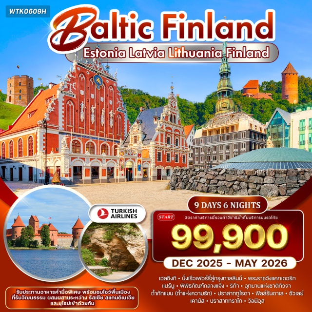 Day 1 : สนามบินสุวรรณภูมิ – อิสตันบูล – เฮลซิงกิ(ฟินแลนด์) Day 2 : ชมกรุงเฮลซิงกิ – นั่งเรือเฟอร์รี่สู่กรุงทาลลินน์(เอสโตเนีย) Day 3 : ทาลลินน์(เอสโตเนีย) – พระราชวังแคทเดอริก – ชมเมืองเก่าDay 4 : ทาลลินน์ – แปร์นู – พิพิธภัณฑ์กลางแจ้ง – ริก้า(ลัตเวีย)Day 5 : ริก้า(ลัตเวีย) – ชมเมือง – อุทยานแห่งชาติกัวจา - ถ้ำกัทแมน(ถ้ำแห่งความรัก) – ปราสาททูไรดา – ริก้า – ชมเมืองเก่าDay 6 : ริก้า – ฟิลส์รันดาเล(ลัตเวีย) – ซัวเลย์(ลิธัวเนีย) – เคานัสDay 7 : เคานัส – ชมเมืองเก่า – ปราสาททราไก – วิลนีอุส(ลิทัวเนีย) - ดินเนอร์พร้อมเครื่องดื่มชมโชว์พื้นเมืองDay 8 : วิลนีอุส(ลิทัวเนีย) – ชมเมือง – ช้อปปิ้ง – กรุงเทพฯ Day 9 : สนามบินสุวรรณภูมิ