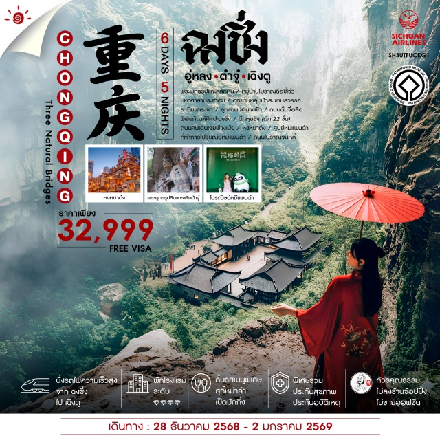 Day 1 : กรุงเทพฯ-ฉงชิ่ง Day 2 : ฉงชิ่ง-ต้าจู๋-พระพุทธรูปแกะสลักหิน-ต้าจู๋-ฉงชิ่ง-หมู่บ้านโบราณฉือชีโข่ว-มหาศาลาประชาคม-Raffles City Day 3 : ฉงชิ่ง-อู่หลง-อุทยานหลุมฟ้าสะพานสวรรค์-ระเบียงกระจก-อุทยานเขานางฟ้า Day 4 : อู่หลง-ฉงชิ่ง-ถนนต้นฉื่ออี้-พิพิธภัณฑ์ศิลปะฉงชิ่ง-ตึกหุยซิง-ถนนคนเดินเจี่ยฟ่างเป่ย-หงหยาต้ง Day 5 : ฉงชิ่ง-นั่งรถไฟความเร็วสูง-ฉงชิ่ง-ศูนย์หมีแพนด้า-ที่ทำการไปรษณีย์หมีแพนด้า Day 6 : ถนนโบราณจินหลี่-ฉงชิ่ง-กรุงเทพฯ